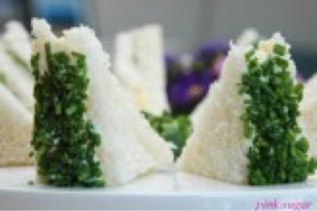 2.Place bread on a work surface. Butter each slice. Evenly divide egg salad among 1/2 the bread slices. Add lettuce greens or tomato, if desired. Top with remaining slices of bread. For tea sandwiches trim crust and cut in 3 or 4 even pieces. Butter or mayonnaise edge of sandwich and roll in chives or parsley.